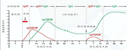 Figure 1: Types of immunoglobulinsUnder normal circumstances, after being infected by a virus, the body will produce a series of changes to resist this invasion, among which the content of immunoglobulin will change as shown in Figure 2: After the antigen enters the body for the first time, it will produce plasma after a certain incubation period. The cells synthesize and secrete antibodies. IgM appeared first, but the antibody maintained for a short time and disappeared quickly, lasting for several days to several weeks in the blood. Next came IgG.Figure 2: Changes in the content of IgM and IgG during infectionIgG is the main component of immunoglobulin, and it is the only immunoglobulin that can pass through the placenta. When IgM is about to disappear, the content of IgG reaches a peak and lasts for a long time in the blood. When exposed to the same antigen again for several months or even years, the amount of the original antibody decreased slightly, which may be due to part of the original antibody being bound by the re-entered antigen, which temporarily reduces the antibody content, but the antibody content increases rapidly in the short term. It may be several to several tens of times higher than the original antibody content, mainly IgG, which lasts for a long time in the body, and IgM rarely increases.In this epidemic, we have conducted research on COVID-19 patients and found that after the virus invades the human body, it takes about 5 to 7 days for IgM antibodies to be produced, and IgG antibodies to be produced after 10 to 15 days. IgM and IgG are both immunoglobulins. What is the difference? We summarize the difference between the two in terms of content, production time, and clinical diagnostic function, as shown in Table 1:Interpretation of IgM and IgG test results
